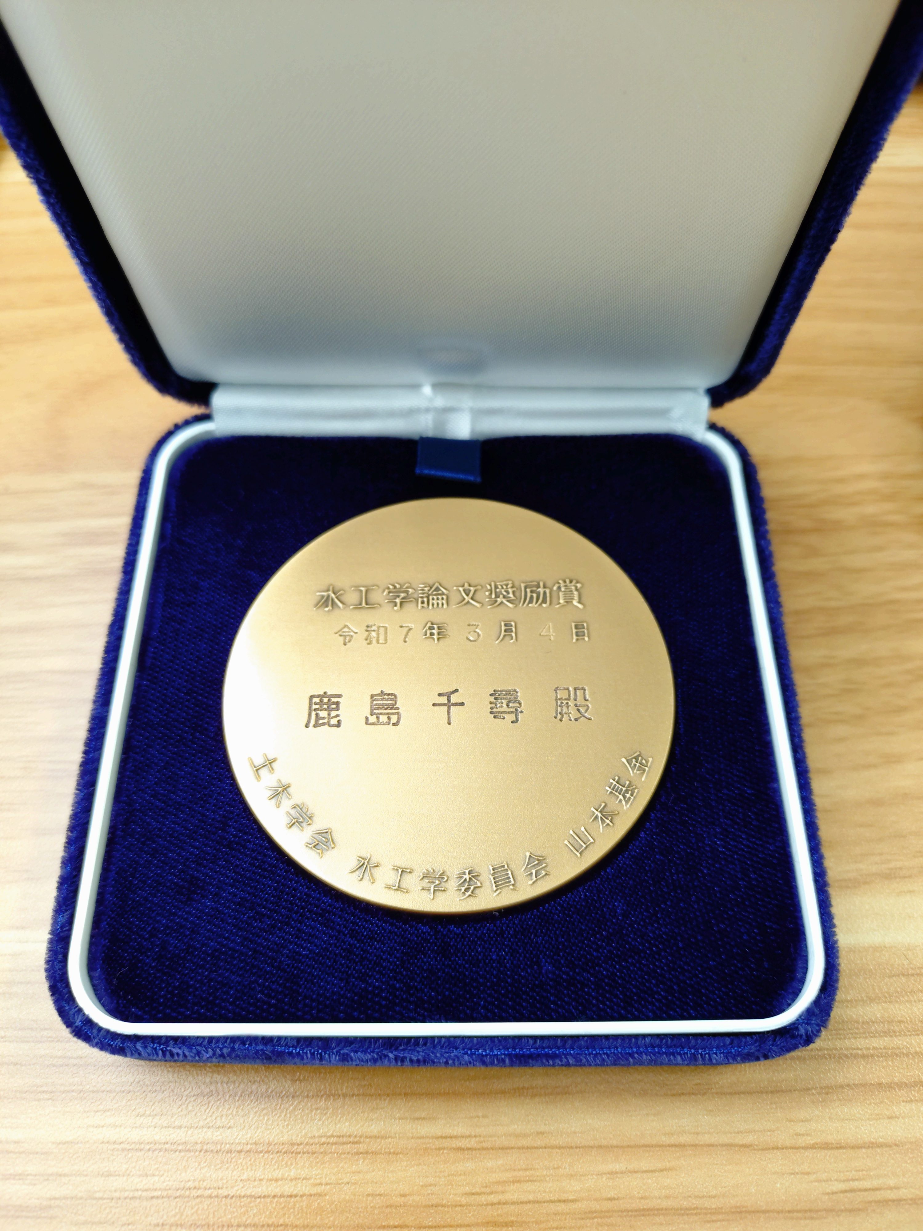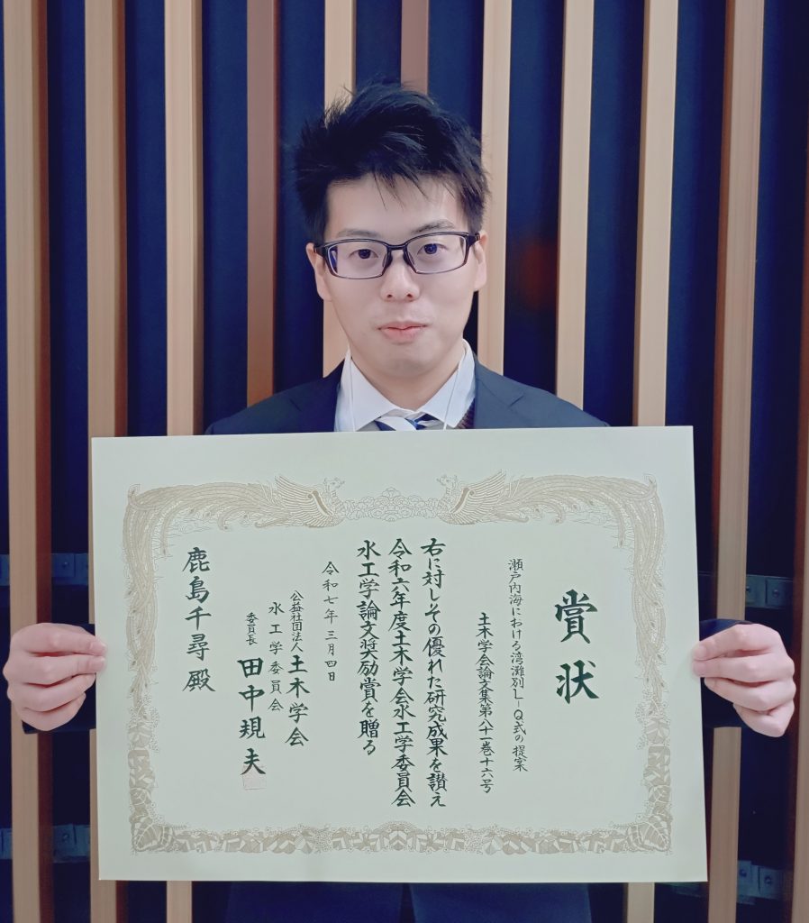 NEWS & TOPICS新着情報・お知らせ 一覧へ 2025-12-16 みず工学 鹿島助教が⽔⼯学論⽂奨励賞を受賞 みず工学領域の鹿島千尋助教が,12月10日から12日に開催された第70回水工学講演会において,「⽔⼯学論⽂奨励賞」を受賞しました. 本賞は,主たる著者として⼟⽊学会論⽂集特集号(⽔⼯学)に掲載された論⽂が,独創性と発展性に優れ,⽔⼯学の発展に対し⼤きな貢献をなし得ると判断された成果であって,かつ,⽔⼯学講演会での発表が明快で要領を得たものであった将来性を有する若⼿研究者に対して授与されるものです. 「瀬戸内海における湾灘別L-Q式の提案」という題目の論文発表が評価され,本賞を受賞しました. 前の記事へ