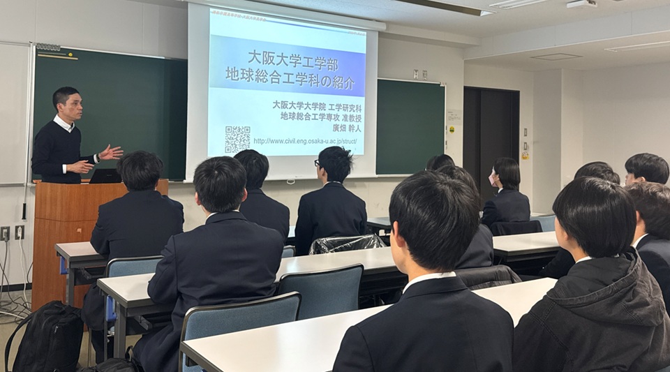 大阪大学工学部、地球総合工学科、社会基盤工学科目のカリキュラムや、大学での勉強、卒業後の進路について説明しました。